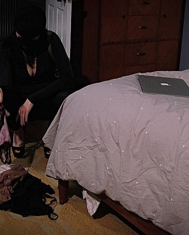A female cat burglar happens to interrupt Riley's pantyhose foot fetish webcam show. Lucky for the cat burglar she's into pantyhose and feet so she takes matters into her own hands and has her own live session with Riley's bound pantyhose legs and feet.