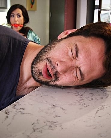 Two criminals have a rich girl tied up. While the one guy goes for pizza, the other messes with girl but accidentally slips on a banana peel and bangs his head. She manages to get loose from the ropes and takes the opportunity to payback the asshole and make him wish they never fucked with her.